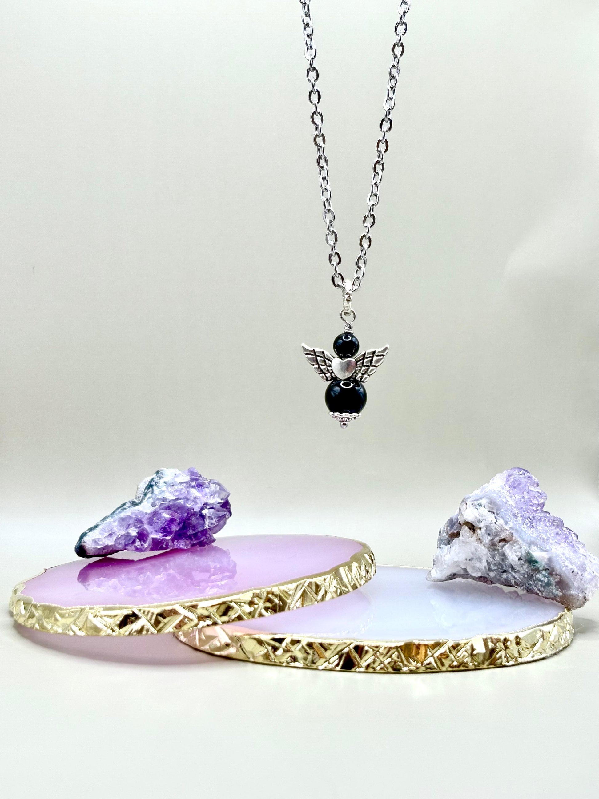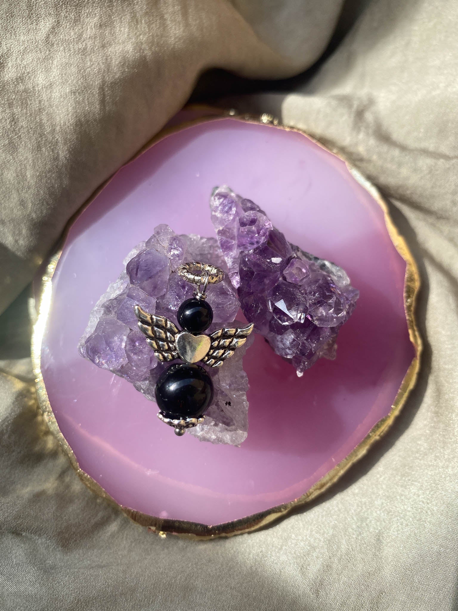La sfera di onice nera, cuore pulsante del talismano, è avvolta da un delicato angelo, che abbraccia la pietra come un custode silenzioso. Secondo la tradizione, l’ossidiana protegge da invidia, negatività e influssi indesiderati, mentre la forma dell’occhio sferico riflette via le energie malevole, agendo come uno scudo invisibile.